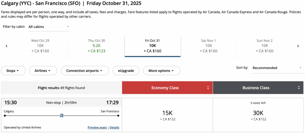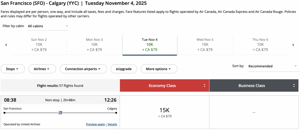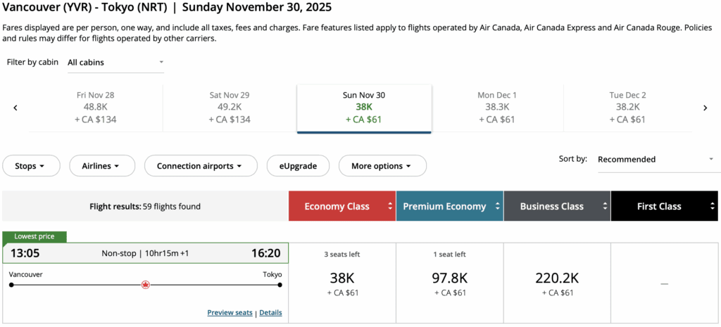 • Price: From 38,000 Aeroplan Points + fees one-way