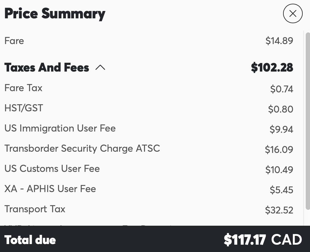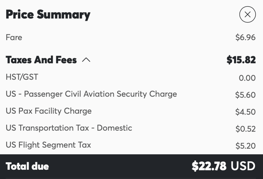 As you can see, on ultra-low-cost airlines like Flair, it’s not uncommon to see a base fare under $20 CAD — with taxes and fees exceed $100 when departing Canada.