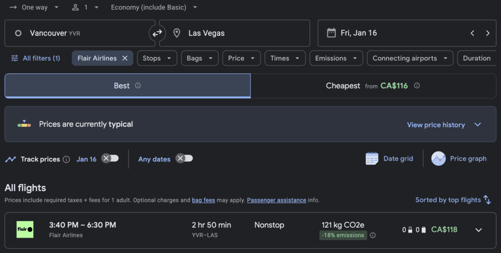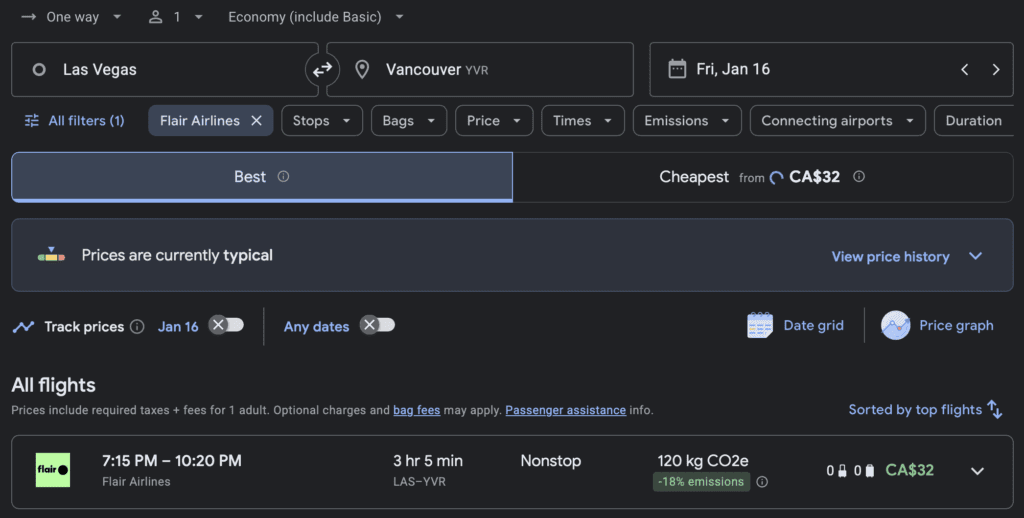Recently, I spotted a one-way Las Vegas → Vancouver flight for just $32 CAD on Flair Airlines on January 16, 2026.