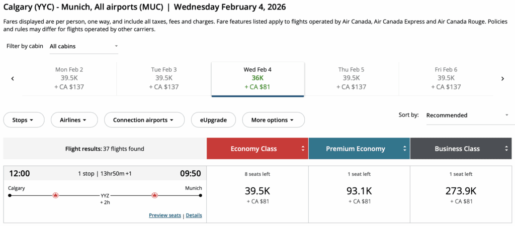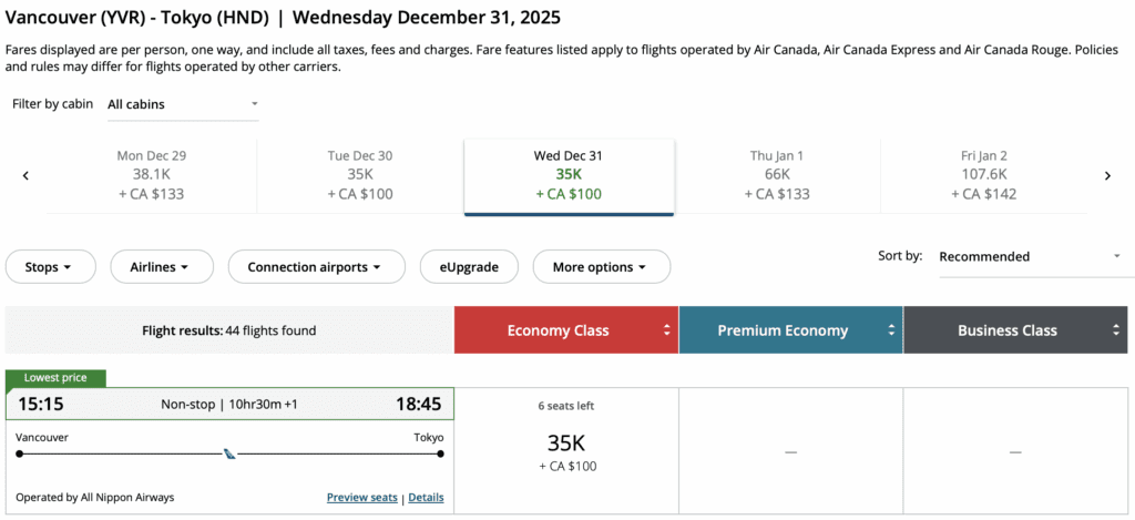 • Price: From 39,400 Aeroplan Points + fees one-way
