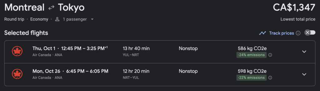 Montreal (YUL) → Tokyo (NRT): From $1,347 CAD round trip on Air Canada (non-stop)