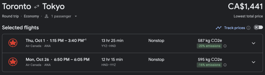 Toronto (YYZ) → Tokyo (NRT): From $1,441 CAD round trip on Air Canada (non-stop)