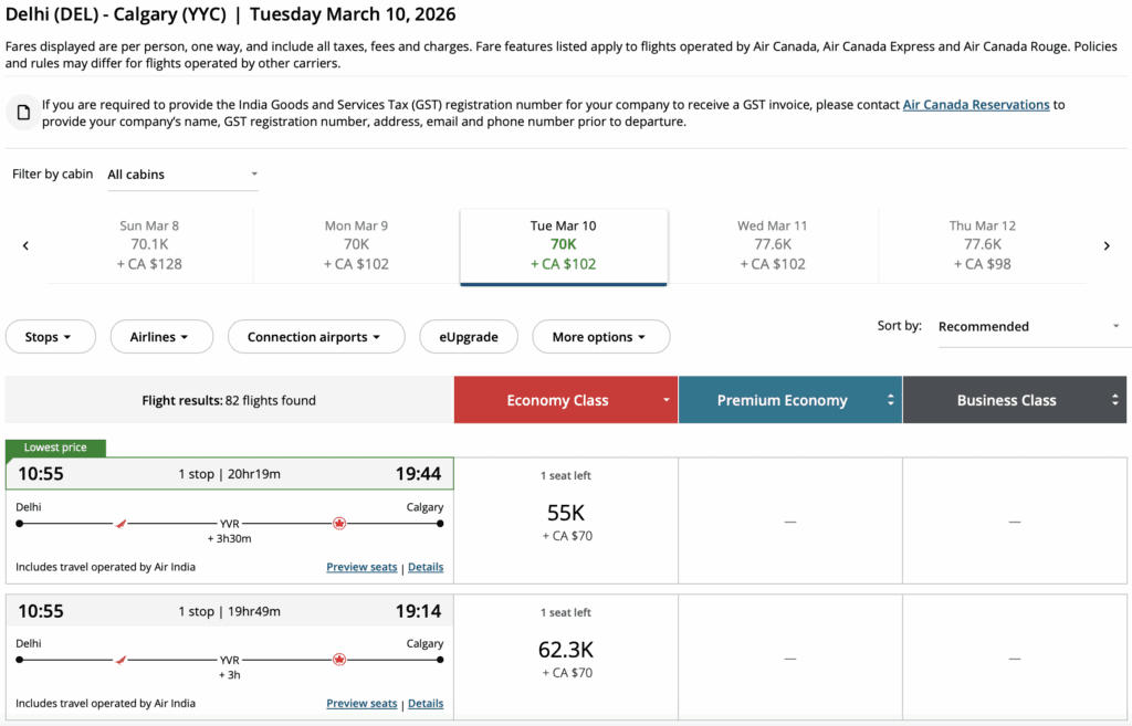 The outbound layover in Vancouver is eight hours, while the inbound is overnight in the U.S.