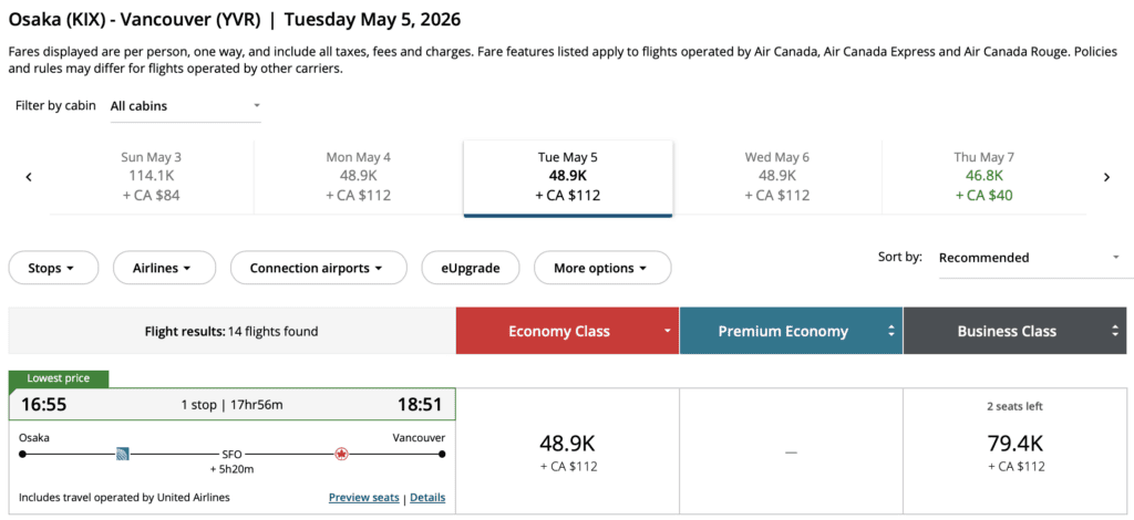 • Price: From 38,100 Aeroplan Points + fees one-way