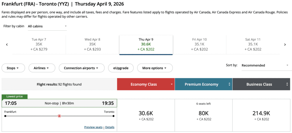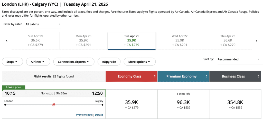 • Price: From 35,100 Aeroplan Points + fees one-way