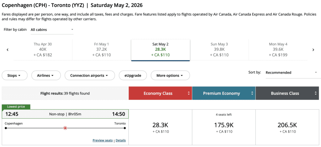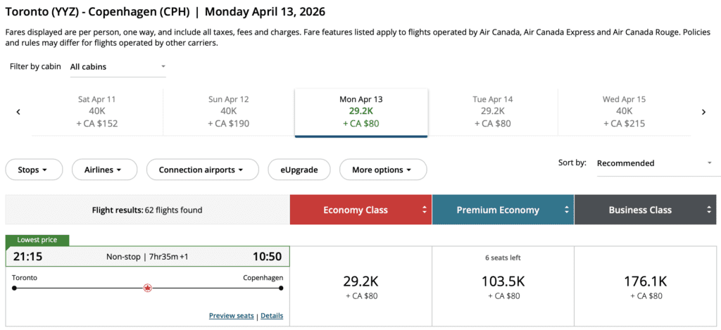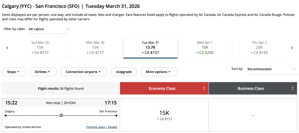 You’ll get the most value from your Aeroplan Points on this route if you book itineraries that are more last-minute, as the cash price will have increased dramatically.
