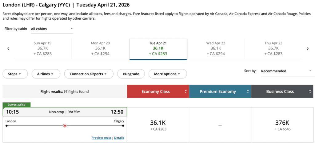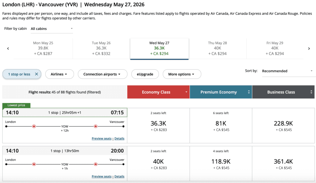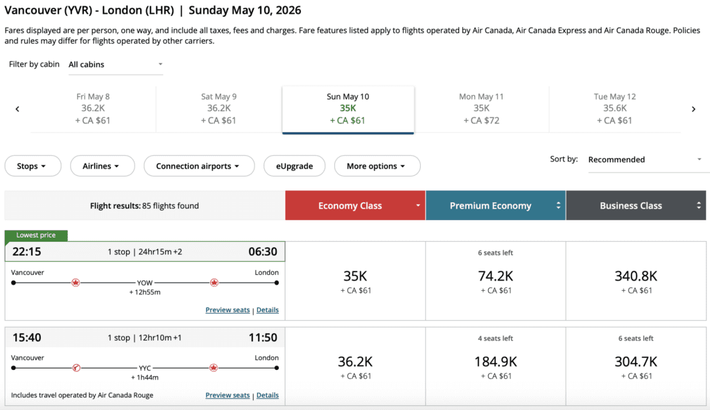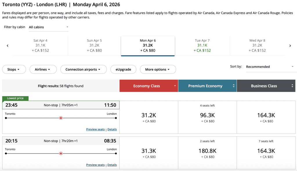 Think round-trip fares from $220 within Canada, $398 to sun destinations, $559 to Europe, and Aeroplan redemptions starting at 30,600 points + fees one-way.