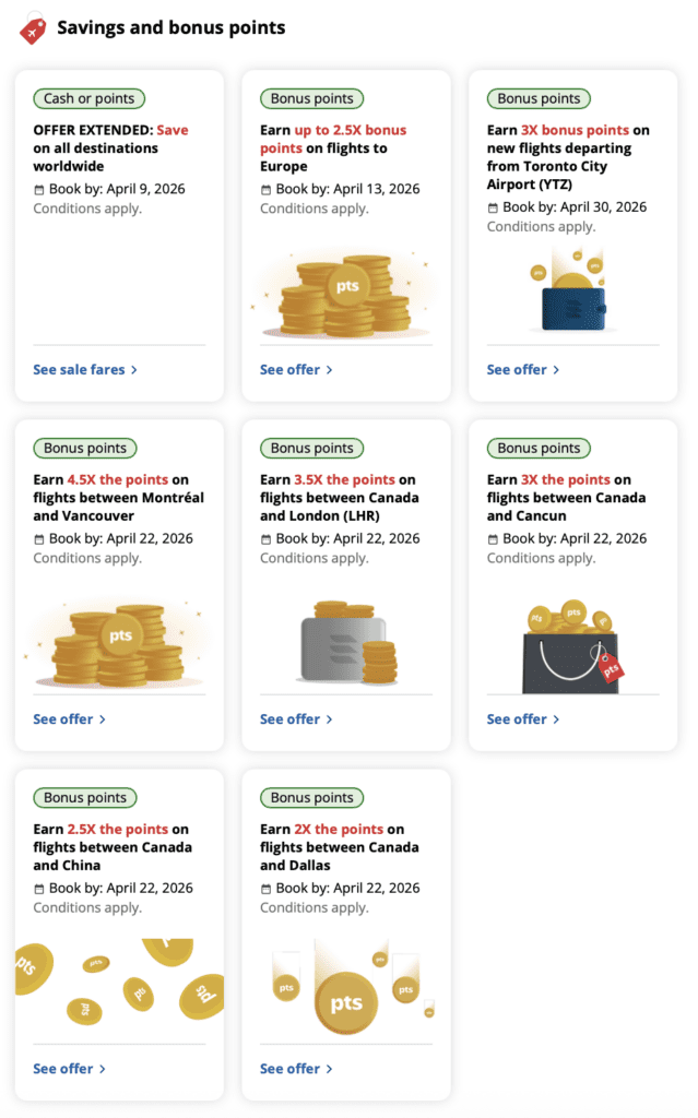 On another note, Air Canada has a discount on base fares for all their routes. As well, there are many routes where you can earn bonus Aeroplan points.