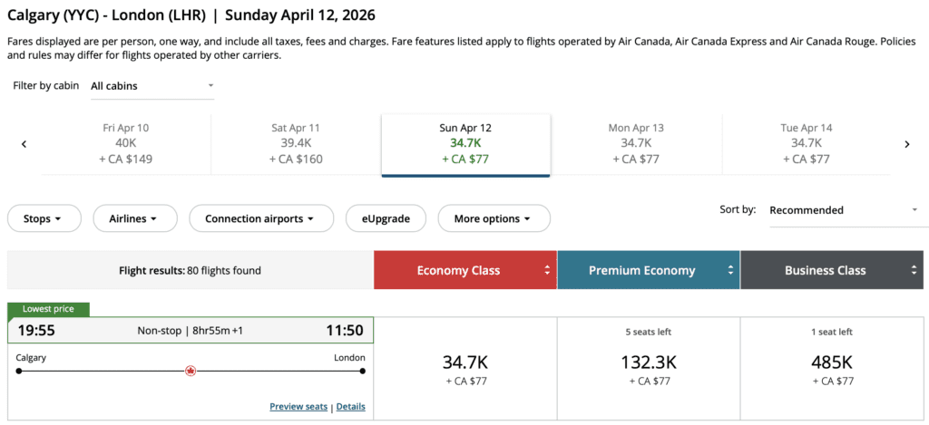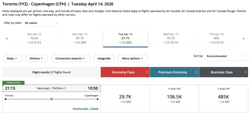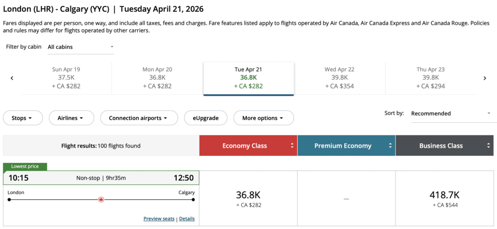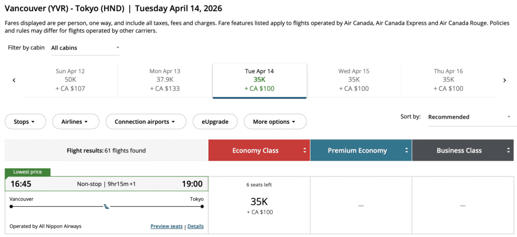 • Price: From 34,700 Aeroplan Points + fees one-way