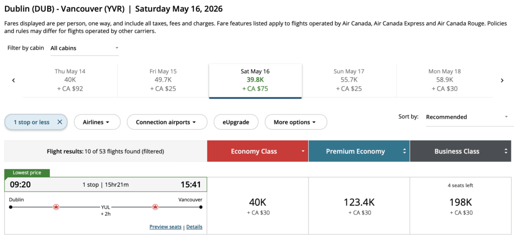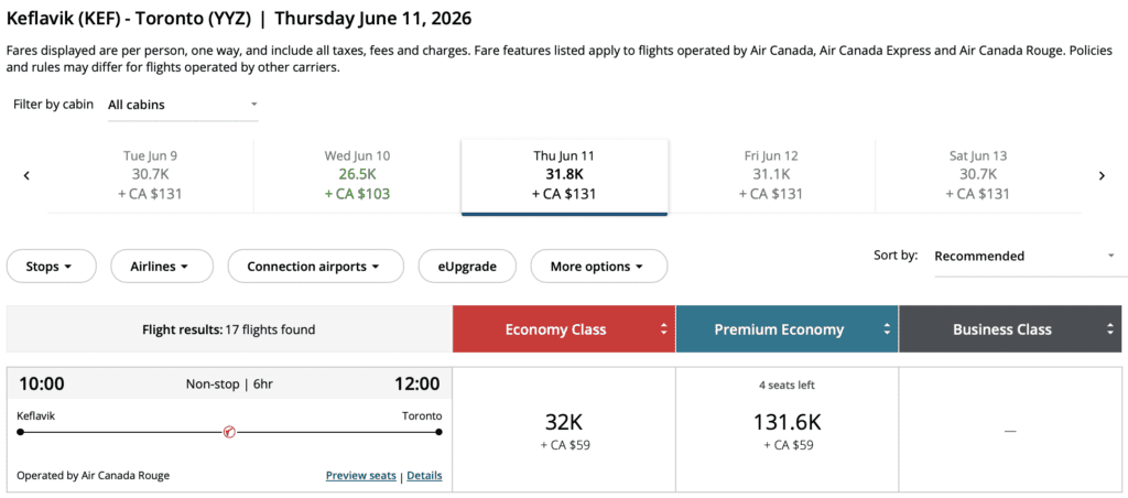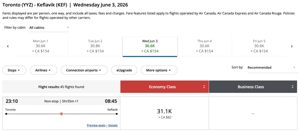 Think round-trip fares from $183 within Canada, $376 to sun destinations, $542 to Europe, $670 to Asia, and Aeroplan redemptions to Europe starting at 31,100 points + fees one-way.