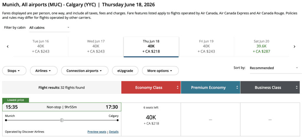 Many direct outbound redemptions are available. Inbound options are limited, and their dates align too closely with outbound flights to make a realistic round trip, so I’m showcasing a one-layover inbound option instead.